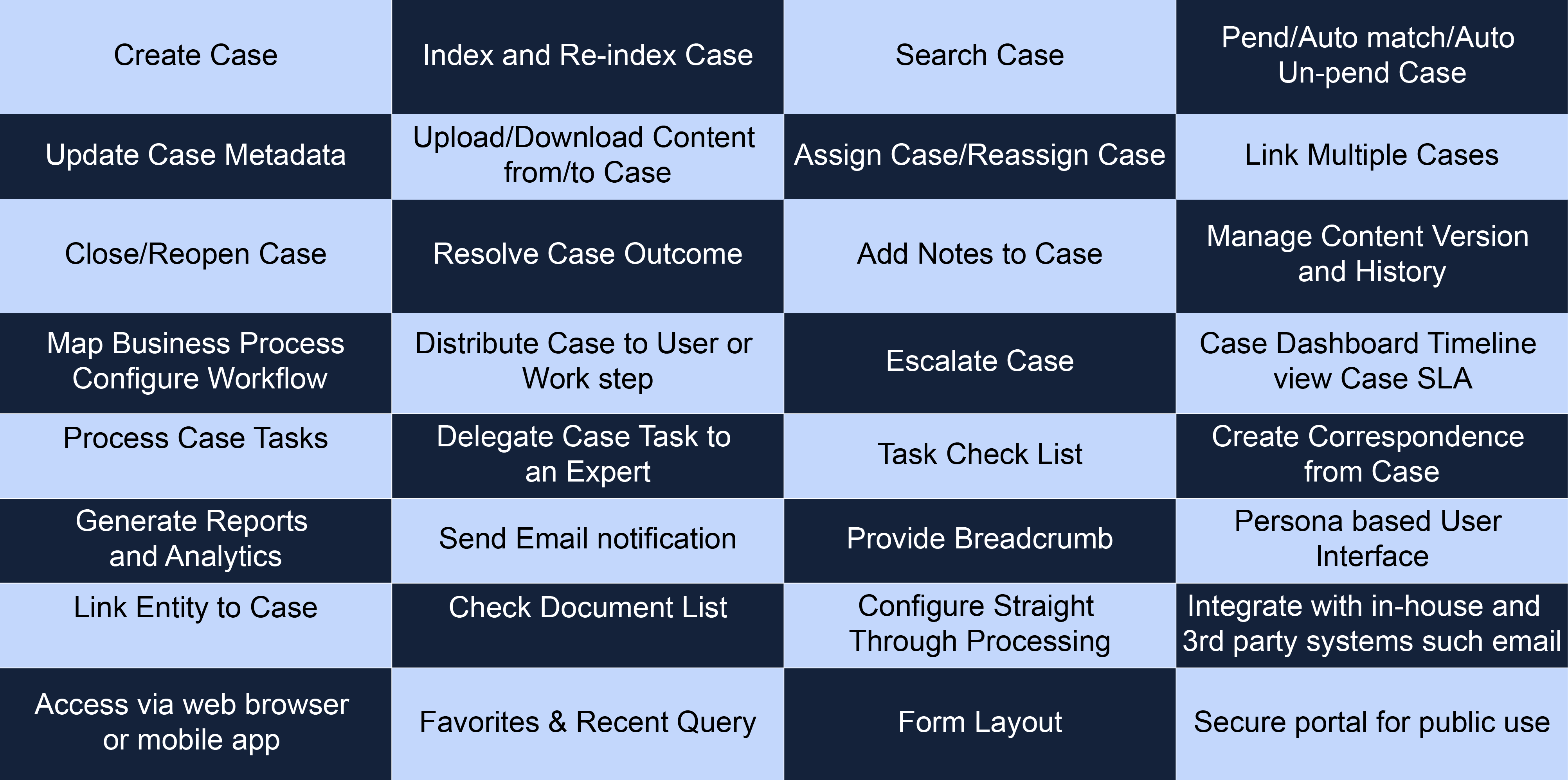 Case Management typically involves creating a case to enable to recording of a new customer transaction such as an application for a loan, mortgage or insurance. The case is then subject to the collaborative, dynamic, human, and information-intensive input process based on domain expertise, knowledge, rules, events, and more, to arrive at outcomes with insights. Outcomes could be as simple as an approval of a loan, mortgage or insurance application or it could result in the generation of a bunch of complicated reports or agreements, or it could possibly represent the start of yet a new case for further processing. A very important aspect of the outcome is insight; i.e., who worked on what, and when. This is usually presented in form of tabular or graphical reports via analytics sub systems. Once the case is processed and completed, it is retained for short term, long term or forever, and subsequently purged based business retention rules. A case folder usually contains documents, metadata, collaborative discussions, work history, artefacts, and other information needed to process and manage the case.