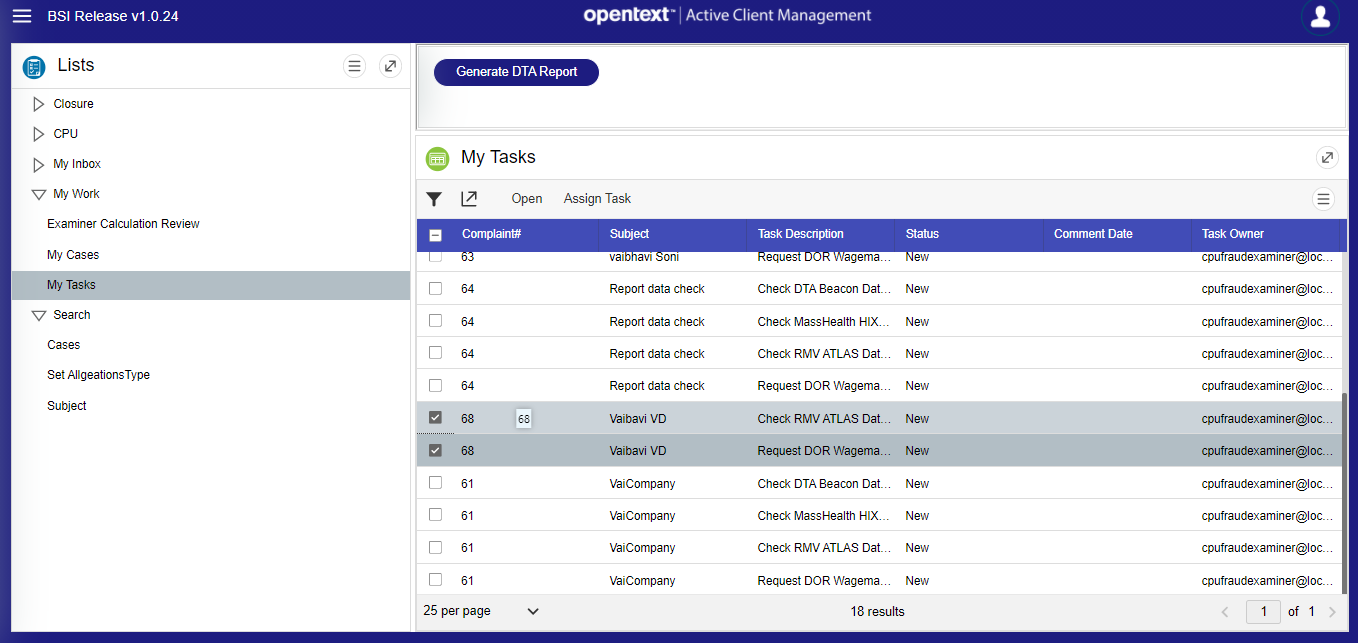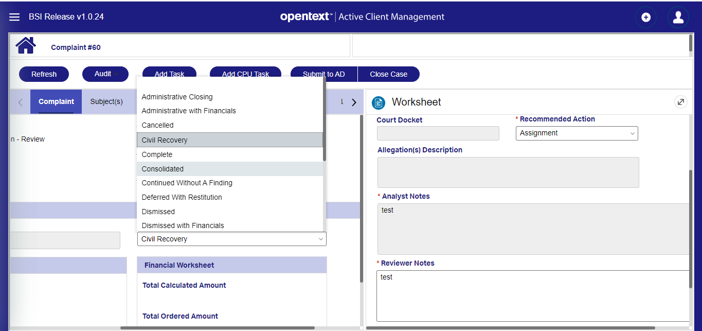 A case is a unit of work created in response to a request from an Entity to perform an action, such as creating a new policy, handling a complaint, or processing a claim. It is used to manage all the activities in an end-to-end process that must be carried out in response to a customer's request. All information about a case is stored in a Case Work Folder. Each task needed for a case is represented by a Work Item, which is assigned to a Work List (e.g., applying for a new policy, updating personal details, or filing a claim). A case can have more than one work folder, depending on the work being completed. A case can be in progress or completed. While it is in progress, various tasks can be carried out to respond to the original request. A case is only considered complete when the request has been satisfied, and no further activities are required.
