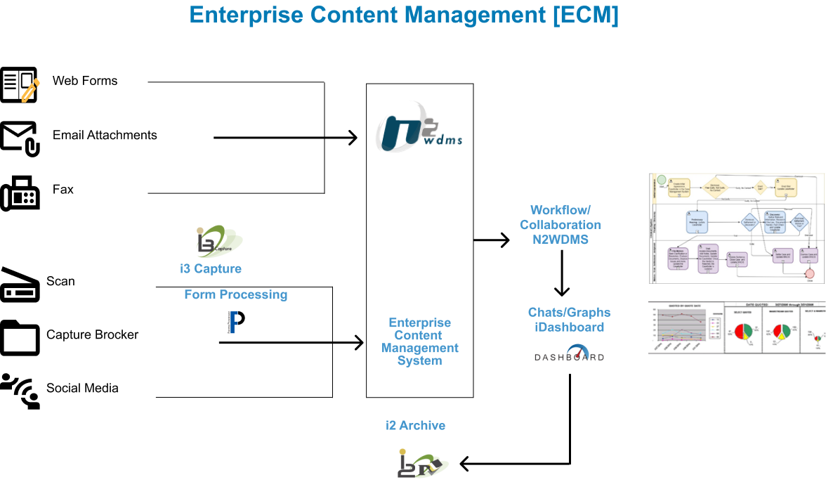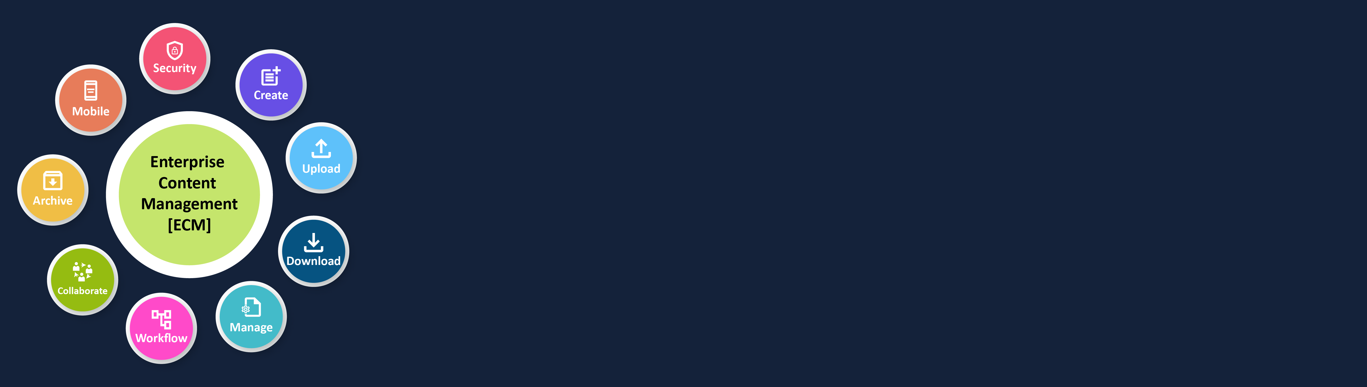 Enterprise Content Management helps you better manage the creation, capture, revision, approval, consumption, storage, retrieval, retention, purge, collaboration and transmission of content and documents related to your business process securely.
